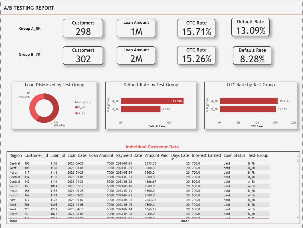 This project analyzes the financial and behavioral impact of increasing the initial loan amount offered to new customers from Ksh 5,000 to Ksh 7,000. Using SQL Server for data analysis and BI tools for visualization, the analysis compares repayment behavior, default risk, repeat borrowing, and profitability between the two customer cohorts. The goal is to provide data-driven insights to inform lending strategy and risk management decisions.